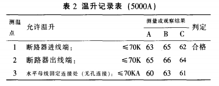 表2是本公司溫升試驗室的質檢人員按照國家標準GB7251.1-1997的有關條款對該樣柜進行溫升試驗,對整個母線槽系統(tǒng)的關鍵處和搭接面進行測量(測得部分溫升記錄)