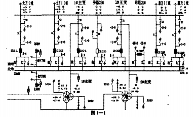1.1一次主接線。圖1-1所示為220KV仿真綜合站的一次系統主接線圖,220KV仿真站內有兩臺三相三繞組有載調壓變壓器,有三個電壓等級220KV、110KV、35KV,接線組別為YO/Y0/A,冷卻系統為強迫油循環風冷系統。220KV系統為雙母帶旁母接線運轉,共有4回線路,有獨立的母聯斷路器和旁路斷路器。110KV系統為雙母帶旁母接線運轉,共有7條線路,有獨立的母聯斷路器和旁路斷路器。35KV系統為雙母帶旁母接線運轉,共有10條線路,有獨立的母聯斷路器和旁路斷路器。