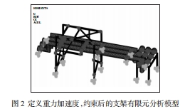 3載荷,捆綁的仿照界說重力加速度9800mm/s2,在支架立柱底端及其他相應方位施加捆綁。如圖2所示,為定義重力加速度,捆綁后的ANSYS仿真圖。