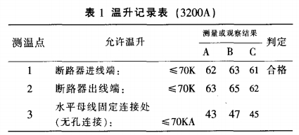 表2是溫升實驗室的質檢人員按照國家規范GB7251.1-1997的有關條款對該樣柜進行溫升實驗,對整個母線槽系統的關鍵處和搭接面進行丈量(測得部分溫升記載)