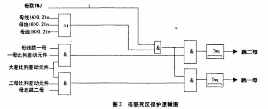 若母聯開關和母聯TA之間發生毛病,斷路器側母線槽跳開后毛病依然存在,正好處于TA側母線槽小差的死區,為進步保護動作速度,本設備專設了母聯死區保護,其邏輯框圖如圖2。