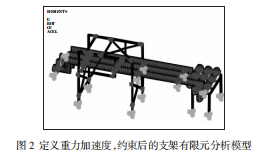 3.4載荷,束縛的模仿界說(shuō)重力加速度9800mm/s2,在支架立柱底端及其他相應(yīng)方位施加束縛。如圖2所示,為界說(shuō)重力加速度,束縛后的ANSYS仿真圖。
