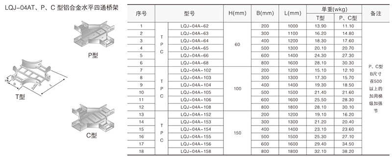 鋁合金電纜橋架在某種結(jié)構(gòu)形式中無其它結(jié)構(gòu)形式中的某-種產(chǎn)品類別,選型可作代用表示。例如:在LQU-CC型槽式鋁合金電纜橋架結(jié)構(gòu)形式中,無鋁合金配線橋架中的LPC-03D, 即表示為LFC-CC-03D。